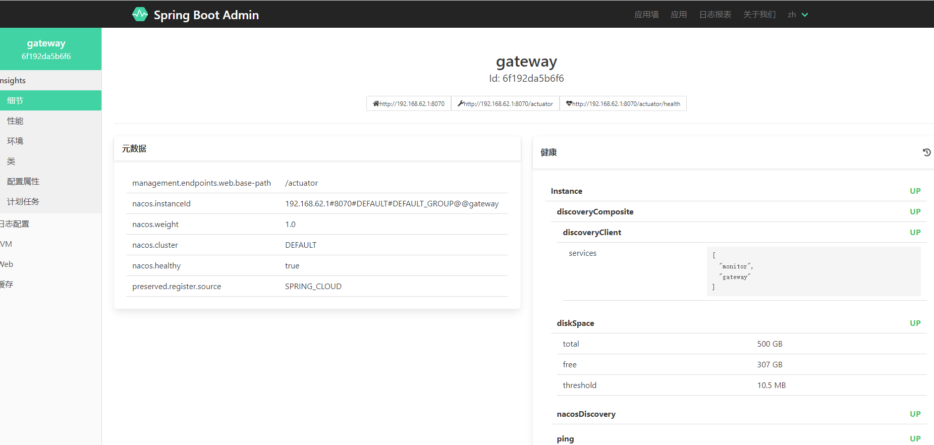 可以看到两个应用可以被发现,如果没有设置monitor项目把nacos当做服务发现中心,将无法获取到具体在线的应用。点击 gateway 进去后可以查看到:
