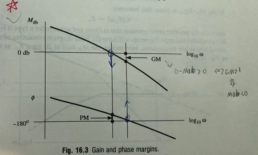 增大K的倍数:NK(N>0),,相当于将Mdb曲线向上平移20lgN,而相位曲线不变(因为相位不发生改变),导致GM减小;gain crossover point会右移,导致PM减小;故系统趋向不稳定。