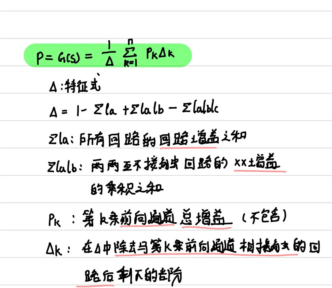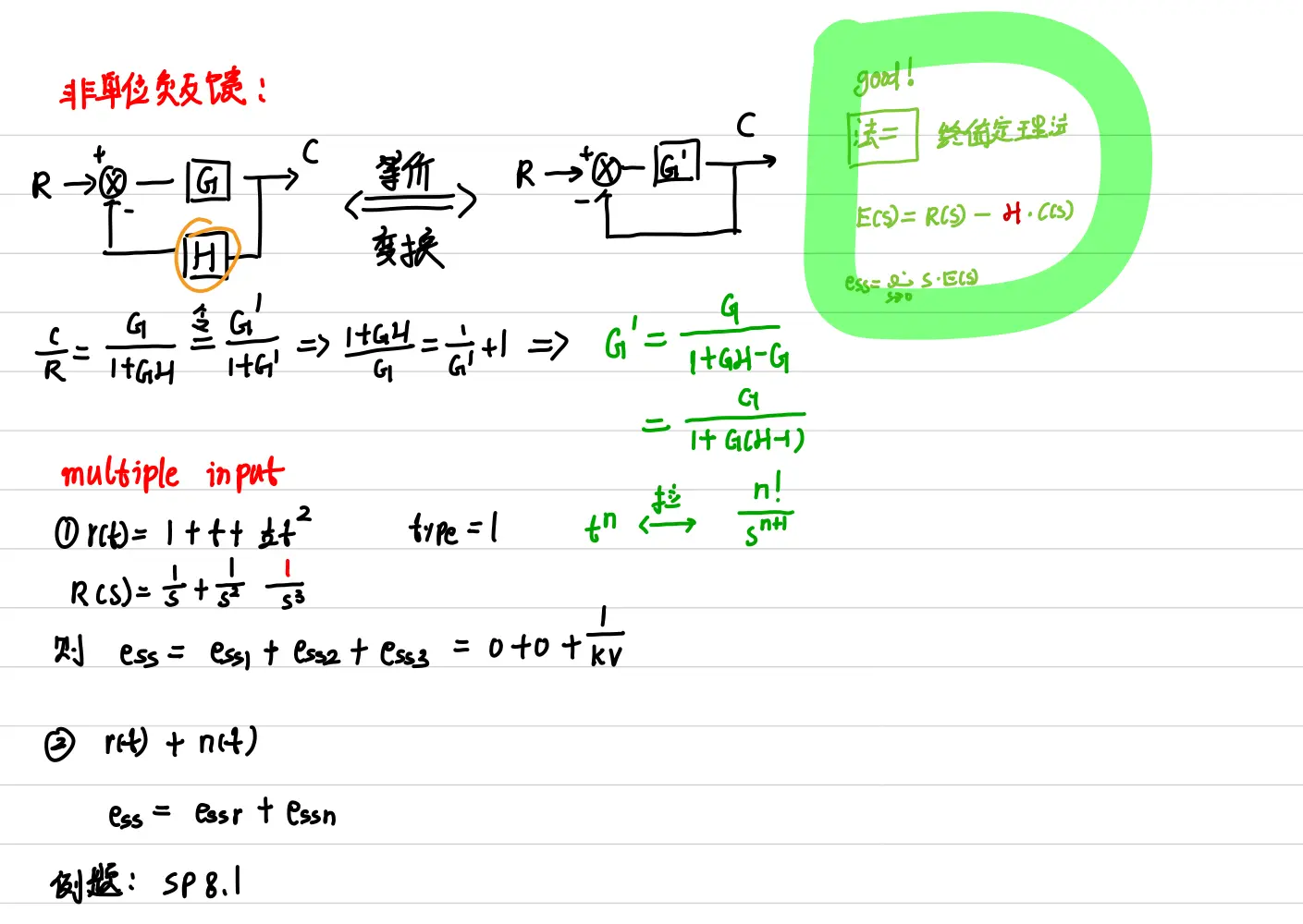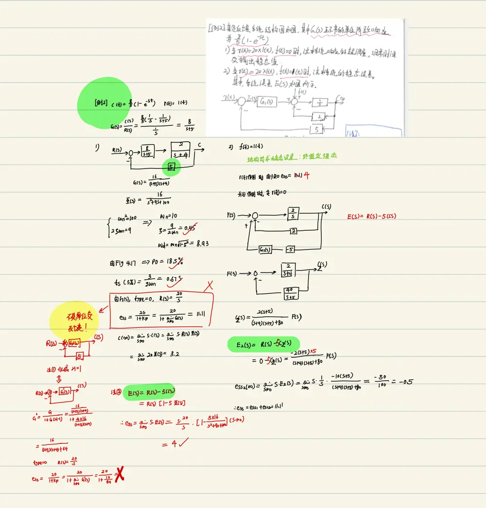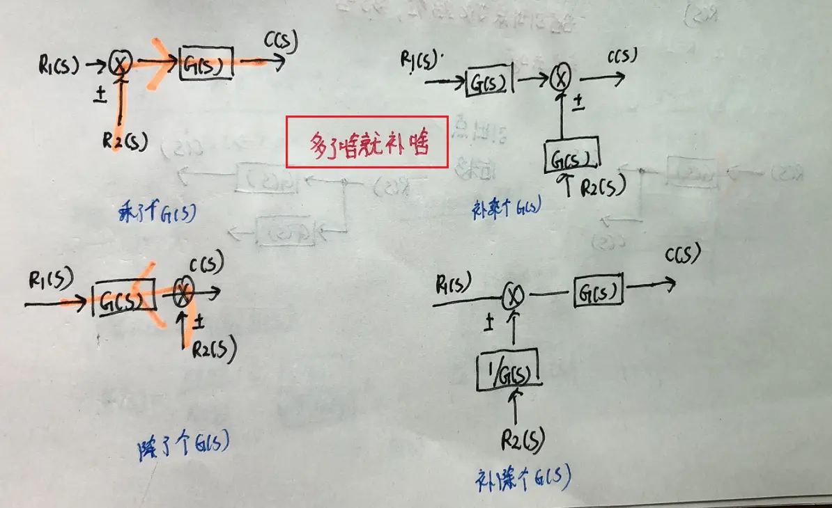 - 反馈:在输入点做加减,输出引回;“正向通道做分子,1±正向通道×反馈通道做分母(综合点不动它,若没有其他输入则可以去掉)”