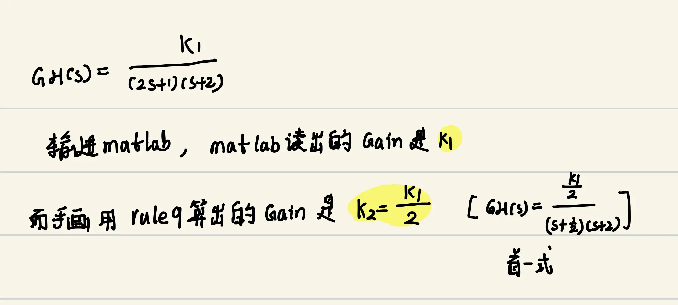【注意】求K时,必须化成首一多项式,此时分子上的常数项才是开环根轨迹增益=才是你画出来的根轨迹上读出来的数值;matlab读出来的是你给定传函的分子常数的值