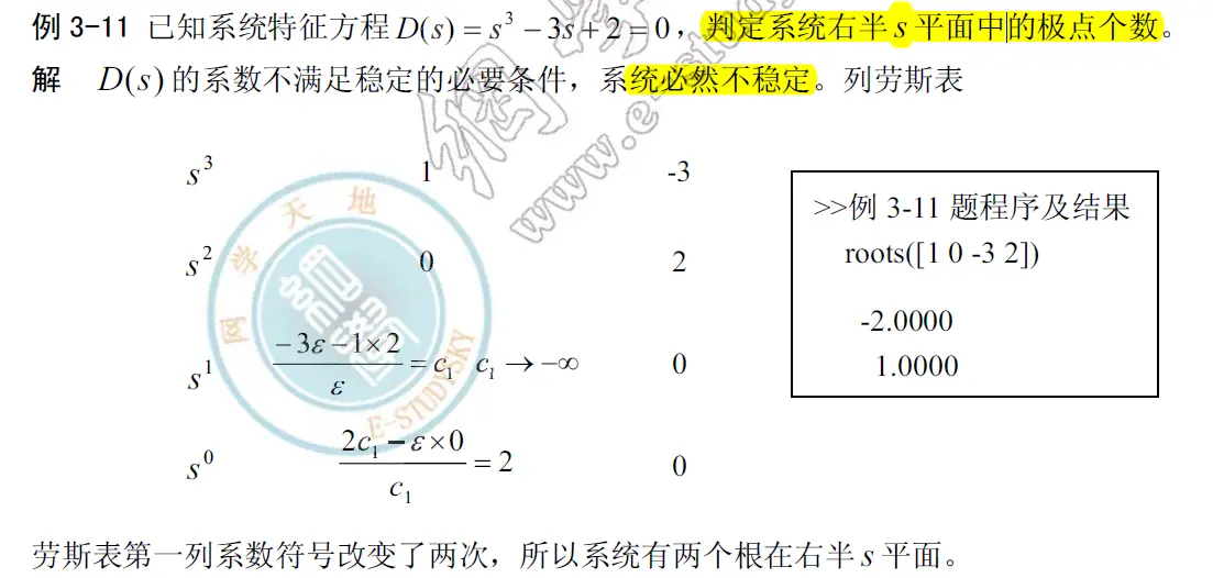 ①第一列出现0,用ε代替继续算劳斯表,最后取极限ε趋近于无穷小的整数(0.0001)(0+),对于缺项的特征方程,仍然可以用劳斯判据判断有几个右半平面极点,如下