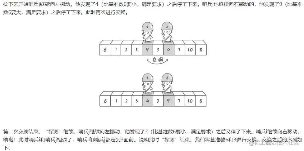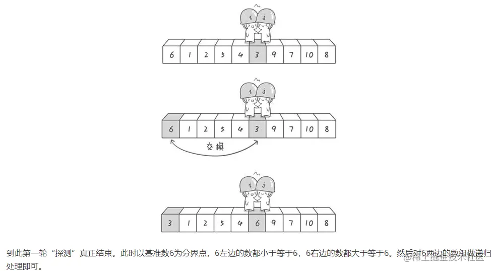 从数组中取出一个数作为标准(暂时用第一个数作为标准)。从左往右开始比较的下标作为i,从右往左开始比较的下标叫j。从左往右依次把数组里面的数和标准数作比较,如果这个数小于标准数,那就把 i 加一,直到遇到大于标准的数。同理,从右往左依次把数组里面的数和标准数作比较,如果这个数大于标准数,那就把 j 减一,直到遇到小于标准的数。然后把这两个找出来的数交换位置。依次找完这些数交换位置。直到 i > j。这时第一个标准数还要换到中间去(即和i的位置的数交换),之后在递归标准数左边和右边的数组。
