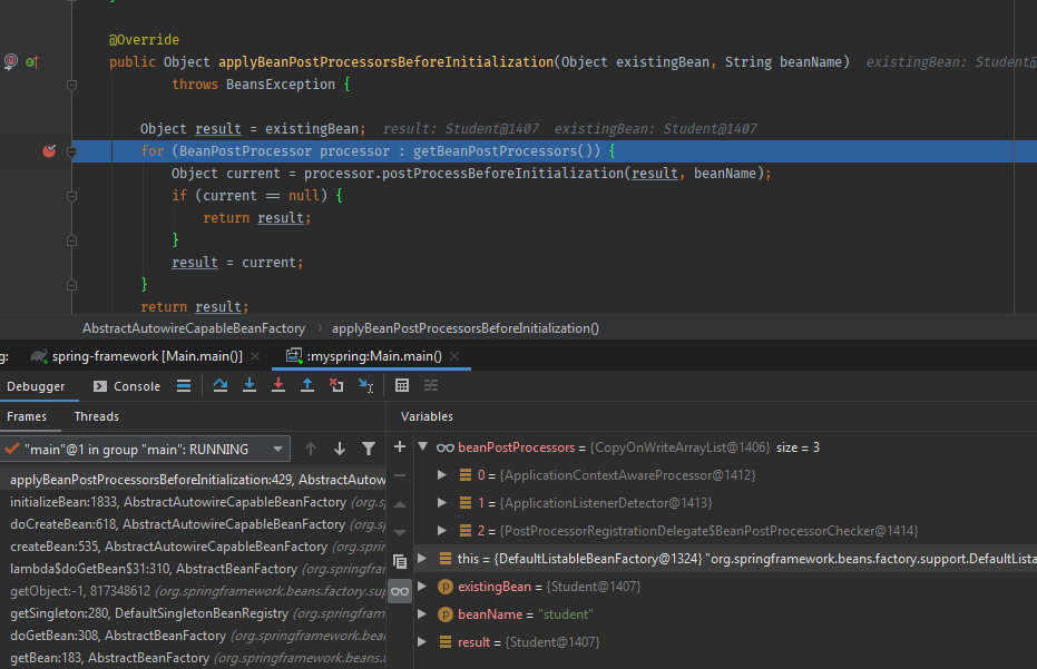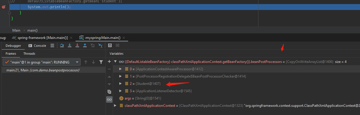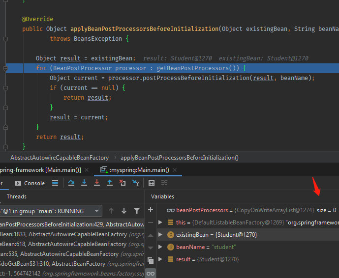 当创建好 bean 然后回调 BeanPostProcessor 的时候、我们发现、在 beanPostProcessors 中并没有 Student 这个对象、也就是没有加入注册进去