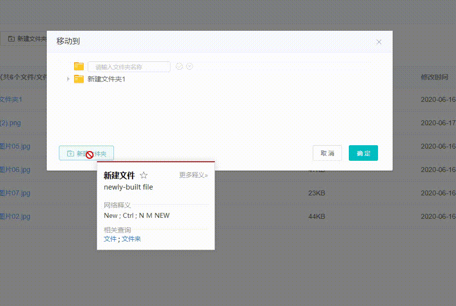 公司的上个项目是一个在线云盘项目。有一个需求是选择文件点击移动按钮会弹出一个资源树列表的对话框,选择文件夹进行文件移动的操作。原本对话框产品的原图是没有新建文件夹的按钮的。结果UI按照百度网盘的页面给我设计了一个。。。