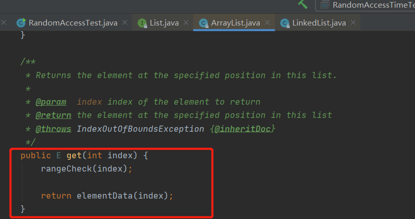 从图中可以看出,ArrayList的get(i) 其实就是通过数组下标直接访问元素,O(1)级别