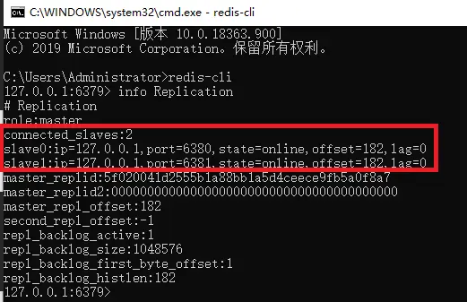然后在一个新cmd下执行*redis-cli*默认连接到端口为 6379 的主节点,然后执行 info Replication 检查一下主从状态是否正常: