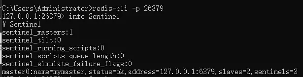连接端口为 26379 的 Redis 节点,并执行 info Sentinel 命令来查看是否已经在监视主节点: