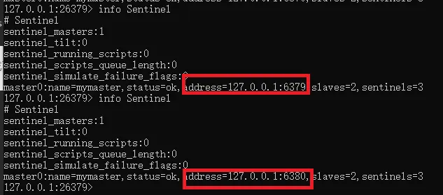 然后我们再去哨兵节点那里查看信息,刚杀掉主节点时可能主节点尚未切换,发现故障并转移需要一段时间: