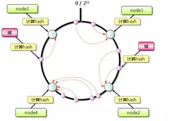 该算法将整个空间组成一个虚拟的圆环,根据每一个数据的key值算出其hash值,确定它在圆环上的位置,然后从此位置顺时针行走,找到的第一个节点就是其所属节点。