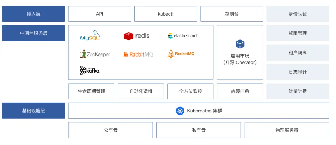 作为基于Kubernetes构建的云原生中间件PaaS平台,轻舟中间件将提供 RDS MySQL、RocketMQ、RabbitMQ、Kafka、Redis、Elasticsearch 等中间件,覆盖企业常用的数据库、缓存和消息等中间件,为企业数字化创新提供高 SLA 保障、高性能、低成本的企业级中间件。