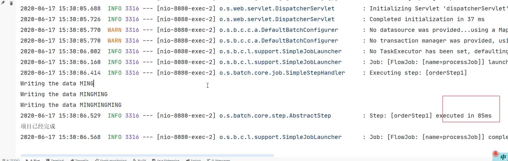 Spring Batch在加载的时候job默认都会执行,把spring.batch.job.enabled置为false,即把job设置成不可用,应用便会根据jobLauncher.run来执行。下面2行是数据库的配置,不配置也可以,使用的嵌入式数据库h2