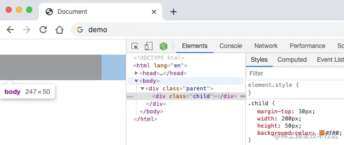 我们给 child 添加了 margin-top,却导致 body 整体下移。