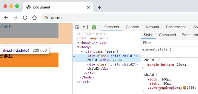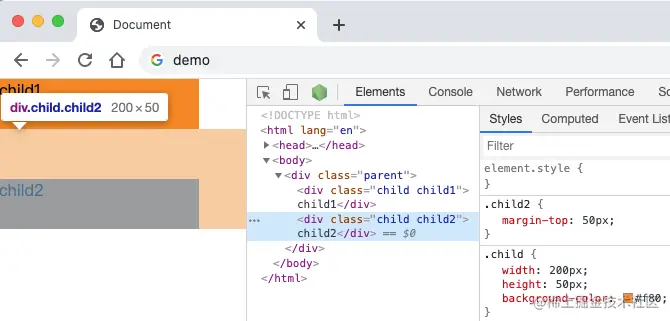 我们给 child1 设置了 margin-bottom:20px,给 child2设置了 margin-top: 50px,但最终的展现效果确实 50px(注意:如果 margin 设置负值的话是什么情况的?可以思考一下😯)