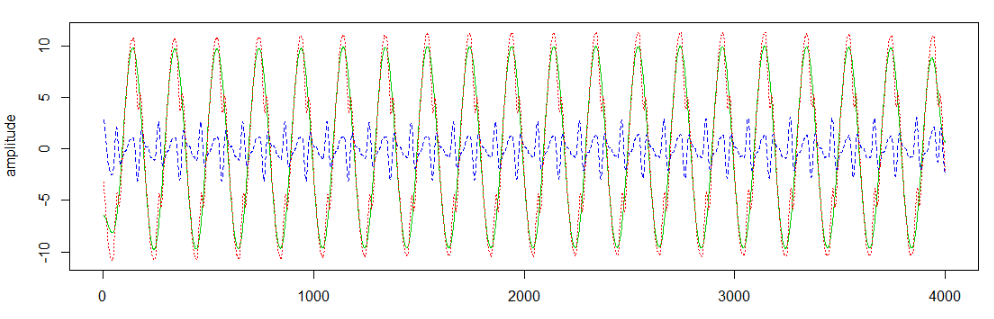 matplot(cbind(l$u[,1],rowSums(l$u[,2:4]),signal),type = "l",col = c(3,4,2) ,ylab = "amplitude")