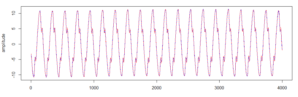 matplot(cbind(rowSums(l$u[,1:4]),signal),type = "l",col = c(4,2) ,ylab = "amplitude")