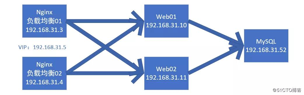 如下图所示,前端有两台的Nginx负载均衡器,用来分发接收到客户端的请求。在前文已经配置好了Nginx01,Nginx02也是一样的配置。现在要在两个Nginx负载均衡器上做高可用配置,Nginx01作为主节点,Nginx02作为备节点。