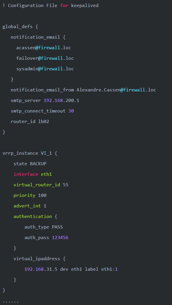 - vrrp_instance VI_1{…}这是一个VRRP实例,里面定义了keepalived的主备状态、接口、优先级、认证和IP信息;
