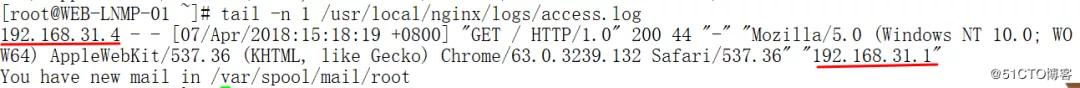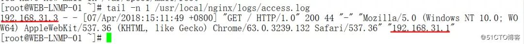 可以看到日志记录到的客户端的IP地址是192.168.31.1,反向代理服务器是主服务器192.168.31.3.下面我们停止keepalived服务,看备节点会不会接替主节点的VIP和服务。