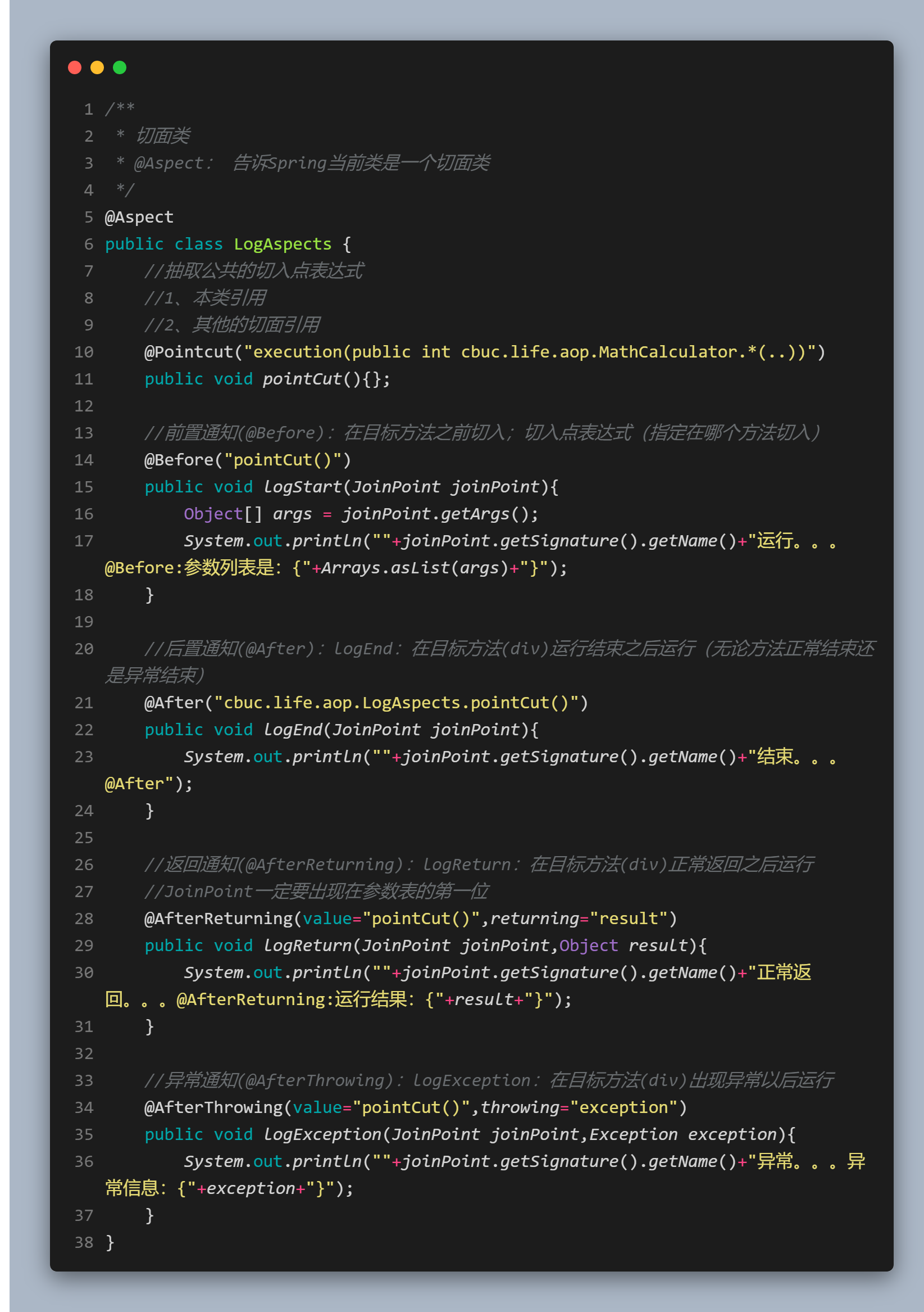 2)在切面类上的每一个通知方法上标注通知注解,告诉Spring何时何地运行(切入点表达式)