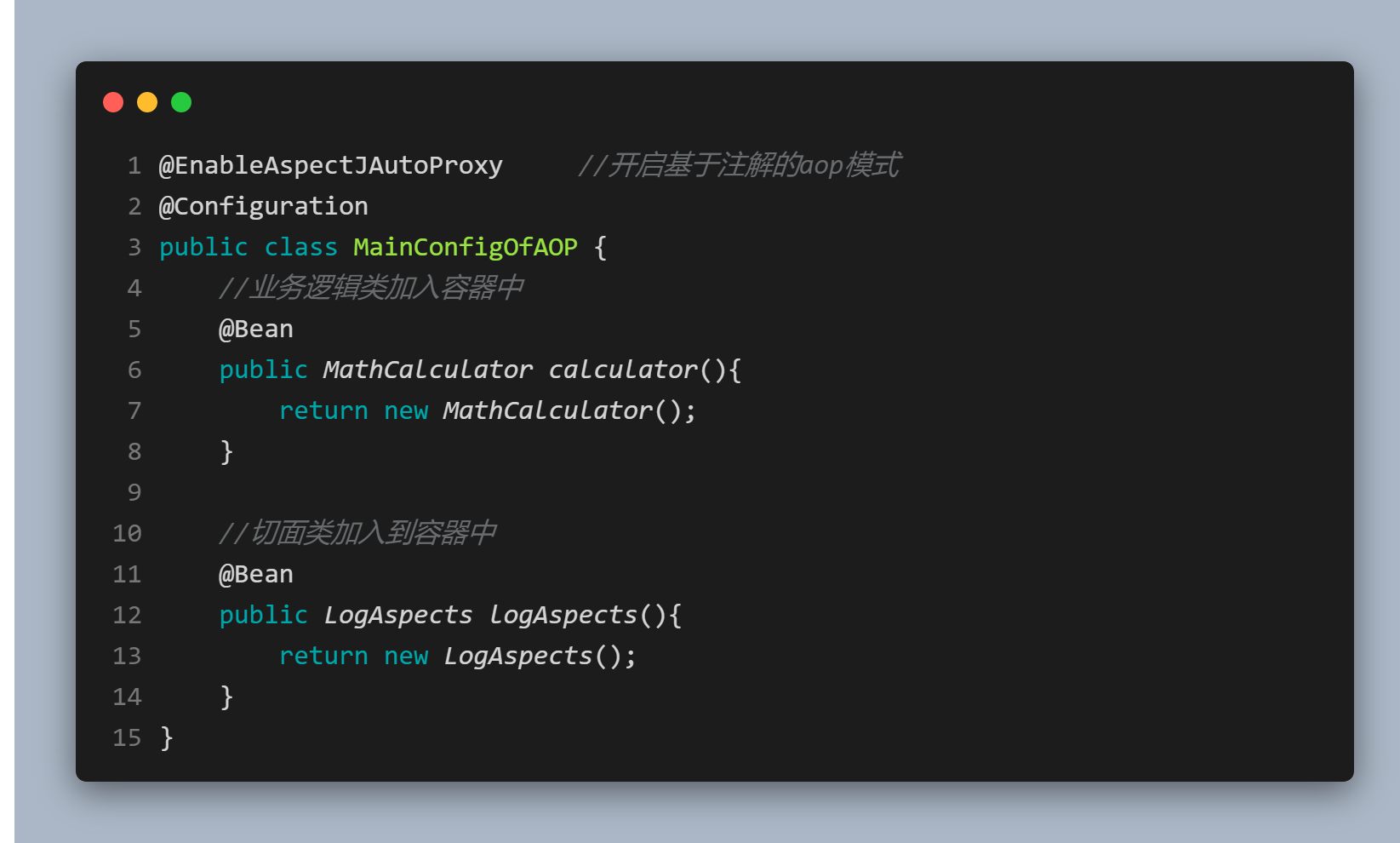 3)开启基于注解的aop模式:@EnableAspectJAutoProxy