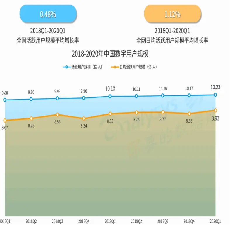 2020年,随着数字用户规模的不断扩大和用户活跃度的稳步提升,我国数字经济发展步入了快车道。报告显示,2020年第一季度,我国数字用户规模高达10.23亿,其中,日均活跃用户规模达到8.93亿。