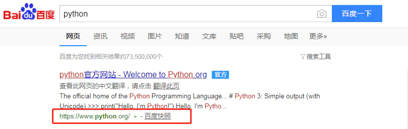 咱们直接在百度输入python,如图所示,点击进入python官网