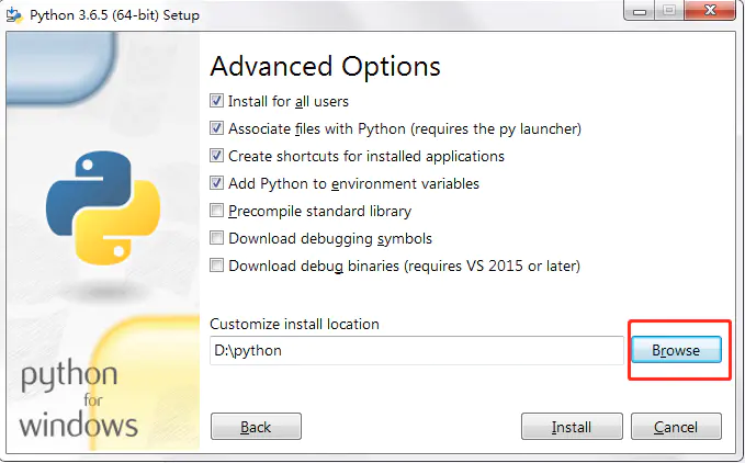 自定义安装python按图勾选,点击Browse选择安装路径,然后点击install