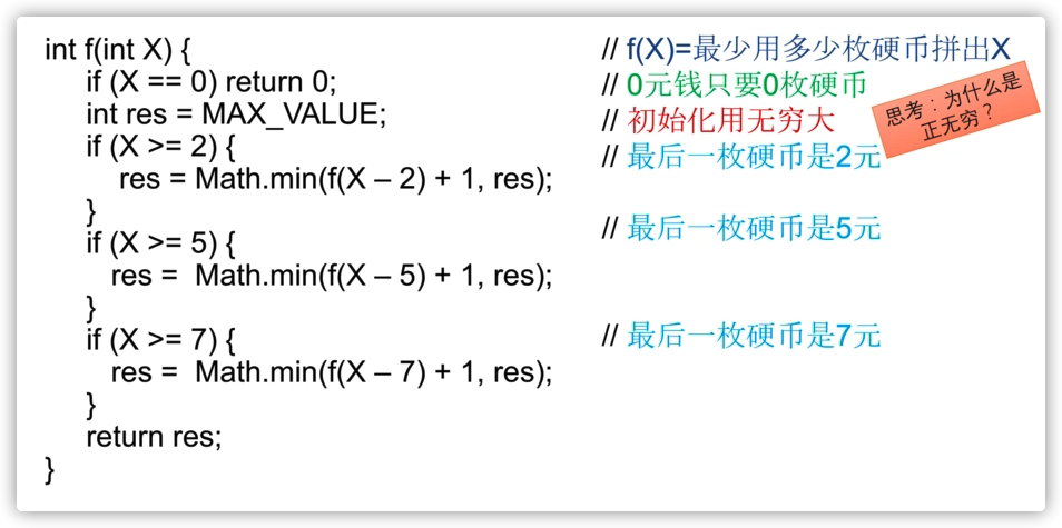 - 好处: 但我们计算f[X]时,f[X-2],f[X-5],f[X-7]都已经得到结果了,避免了重复计算
