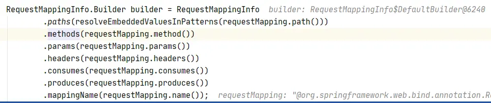 设置了该方法 的映射路径,方法对象,方法参数,设置的方法请求头,消费类型,可接受类型,映射名称等信息封装成RequestMappingInfo对象返回!