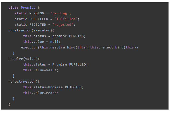 3、我们知道在new promise的时候 ,会在初始化时设置初始status,返回值,传入参数,这个参数是一个function,这个参数接收resolve,reject两个方法作为参数。