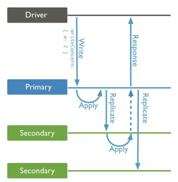 下面以一个副本集架构来描述,一个写操作的流程,来认识MongoDB下的写确认。