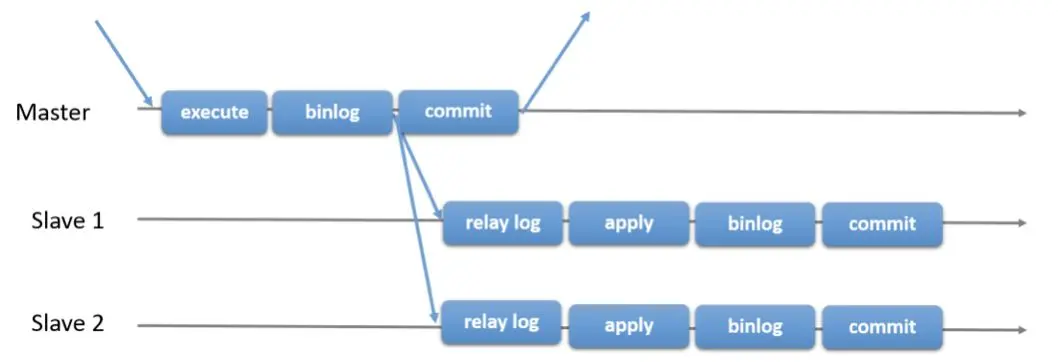 - 异步复制。 主库将事务 Binlog 事件写入到 Binlog文件中,此时主库只会通知一下 Dump 线程发送这些新的Binlog,然后主库就会继续处理提交操作,而此时不会保证这些 Binlog 传到任何一个从库节点上。