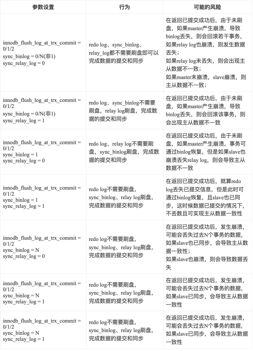 注意: 以上是在开始内部两阶段提交的流程,即innodb_support_xa=true,这个时候可以通过判断binlog来恢复会提交的事务,因此innodb_flush_log_at_trx_commit看起来可有可无;如果未开启内部事务的两阶段提交,则更会复杂,只有innodb_flush_log_at_trx_commit = 1 且 sync_binlog = 1 且 sync_relay_log = 1的情况下,可以保证已提交事务的安全,其他情况都有可能导致数据丢失或者主从数据不一致的风险。