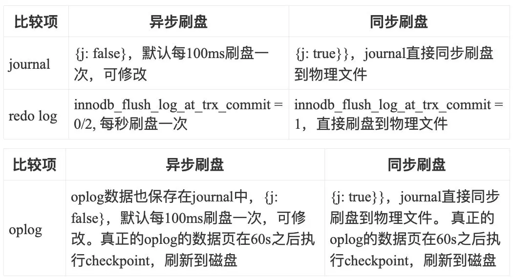 - MongoDB的journal中包含了oplog的信息;而binlog和redo log是两个相对独立的内容;