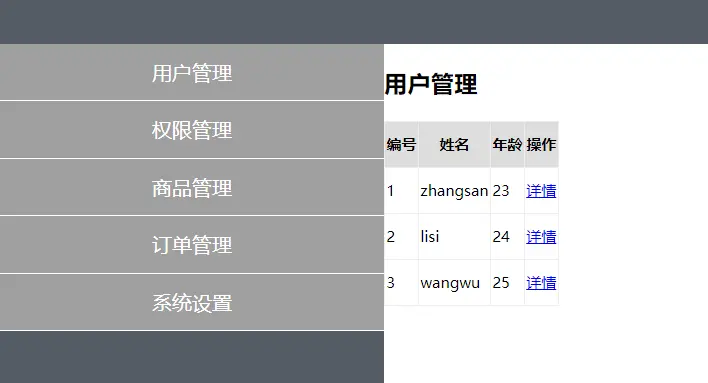 const Users = { data(){ return { userList:[ {id:1,name:"zs",age:18}, {id:2,name:"ls",age:19}, {id:3,name:"wang",age:20}, {id:4,name:"jack",age:21}, ] } }, template:`<div> <h3>用户管理</h3> <table> <thead> <tr> <th>编号</th> <th>姓名</th> <th>年龄</th> <th>操作</th> </tr> </thead> <tbody> <tr :key="item.id" v-for="item in userList"> <td>{{item.id}}</td> <td>{{item.name}}</td> <td>{{item.age}}</td> <td><a href="javascript:;">详情</a></td> </tr> </tbody> </table> </div>`} -