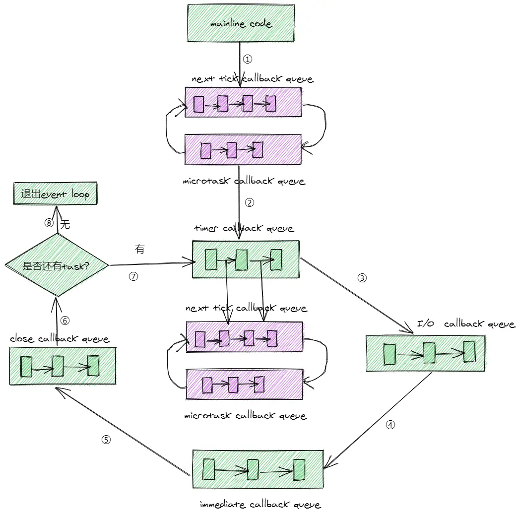 - 最大的不同,在于nodejs evnet loop有个轮询阶段。当evnet loop中所有队列都为空的时候,browser event loop会退出event loop(或者说处于休眠状态)。但是nodejs event loop不一样,它会持续命中轮询阶段,并且在那里等待处于pending状态的I/O callback。只有等待时间超出了nodejs计算出来的限定时间或者再也没有未完成的I/O任务的时候,nodejs才会退出event loop。这就是nodejs event loop跟browser event loop最大不同的地方。