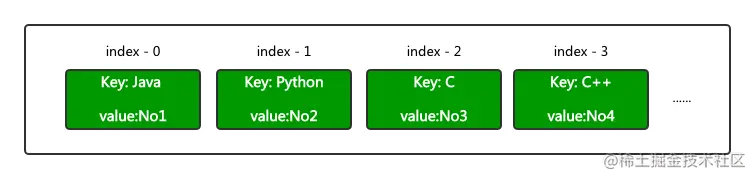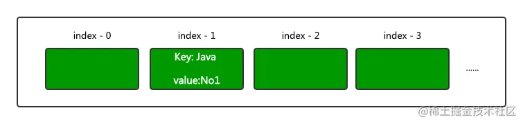举个例子,当我在 Map 中添加一个键为 Java 值为 No1 的元素时,Java 字符串会通过 hash 方法来计算哈希值。假设 Java 字符串的哈希值为1,那么此时 HashMap 的结构就是下面这样。
