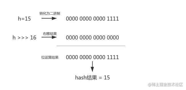 先把15转化为二进制,也就是 0000 1111。然后对哈希值进行无符号右移16位的运算,其实就是在15的32位二进制中取高半区,也就是 0000 0000 0000 0000,最后对这两者做异或运算。