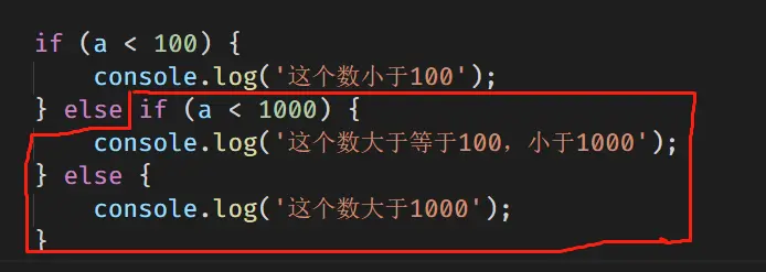 //这里,else里只有if(a < 1000){ console.log('这个数大于等于100,小于1000') } 一个语句,所以省略花括号,然后相对于里面这个if语句,console.log('这个数大于等于100,小于1000')又是一个语句,所以这个if语句的花括号也能省略。