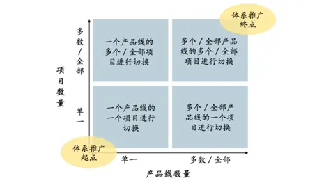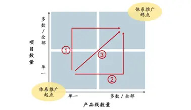 从上图可见,体系推广的起点是单一产品线的单一项目,而体系推广的终点则是全部产品线的全部项目,流程切换过程则是我们在该矩阵中选择走哪一条路线。