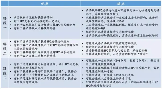 这三种路线,各有优劣势,需要企业根据自身的IPD人才储备(IPMT主任、LPDT、LPMT、PQA、SE等)、对IPD流程的适应性、变革决心、变革文化等方面进行衡量与选择。 以下深入比较三种体系切换路线的优缺点: