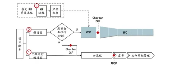 - 路线三:各产品线同步推进,产品线将项目区分走IPD/MM/CDP全流程、裁剪流程,统一一起推进。