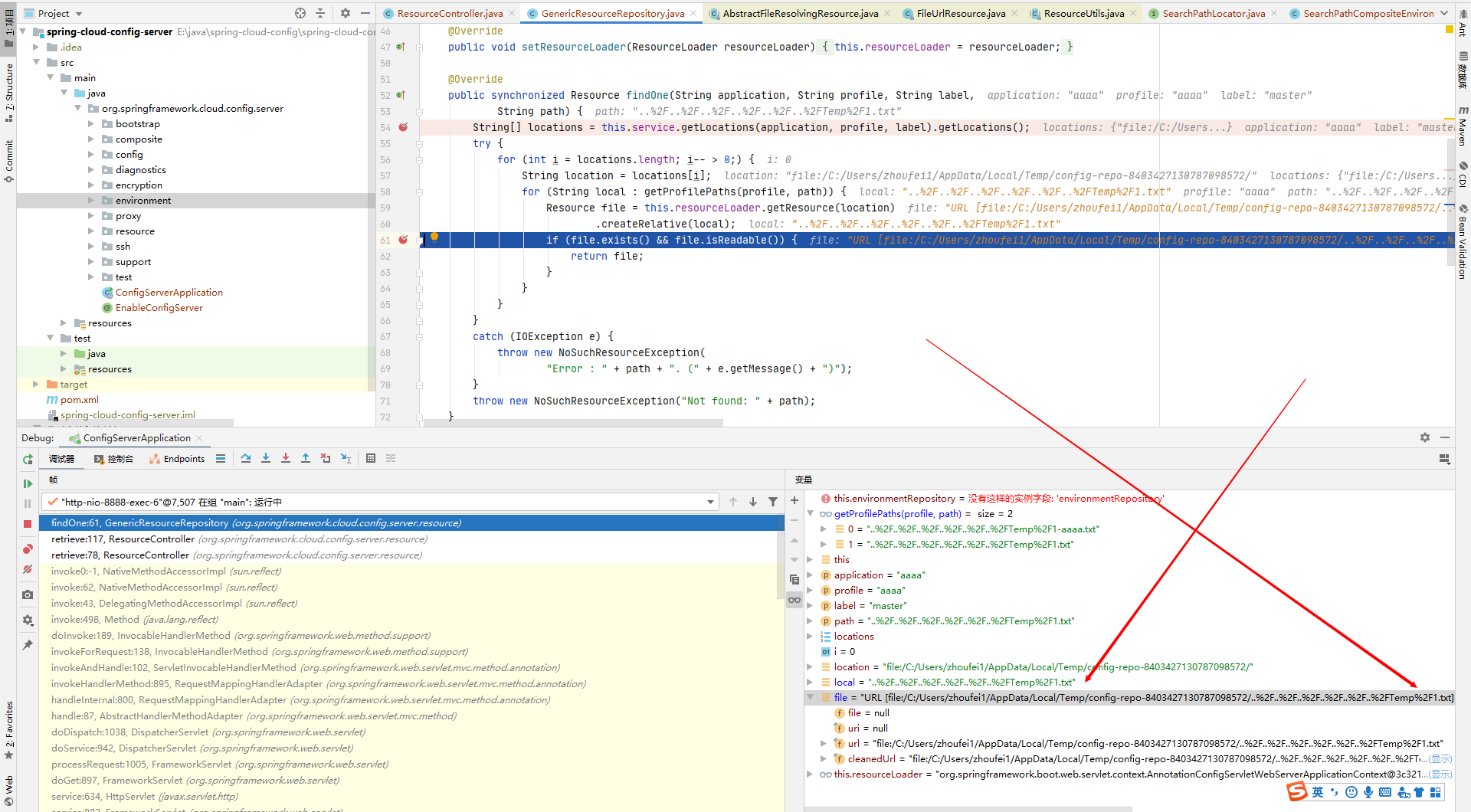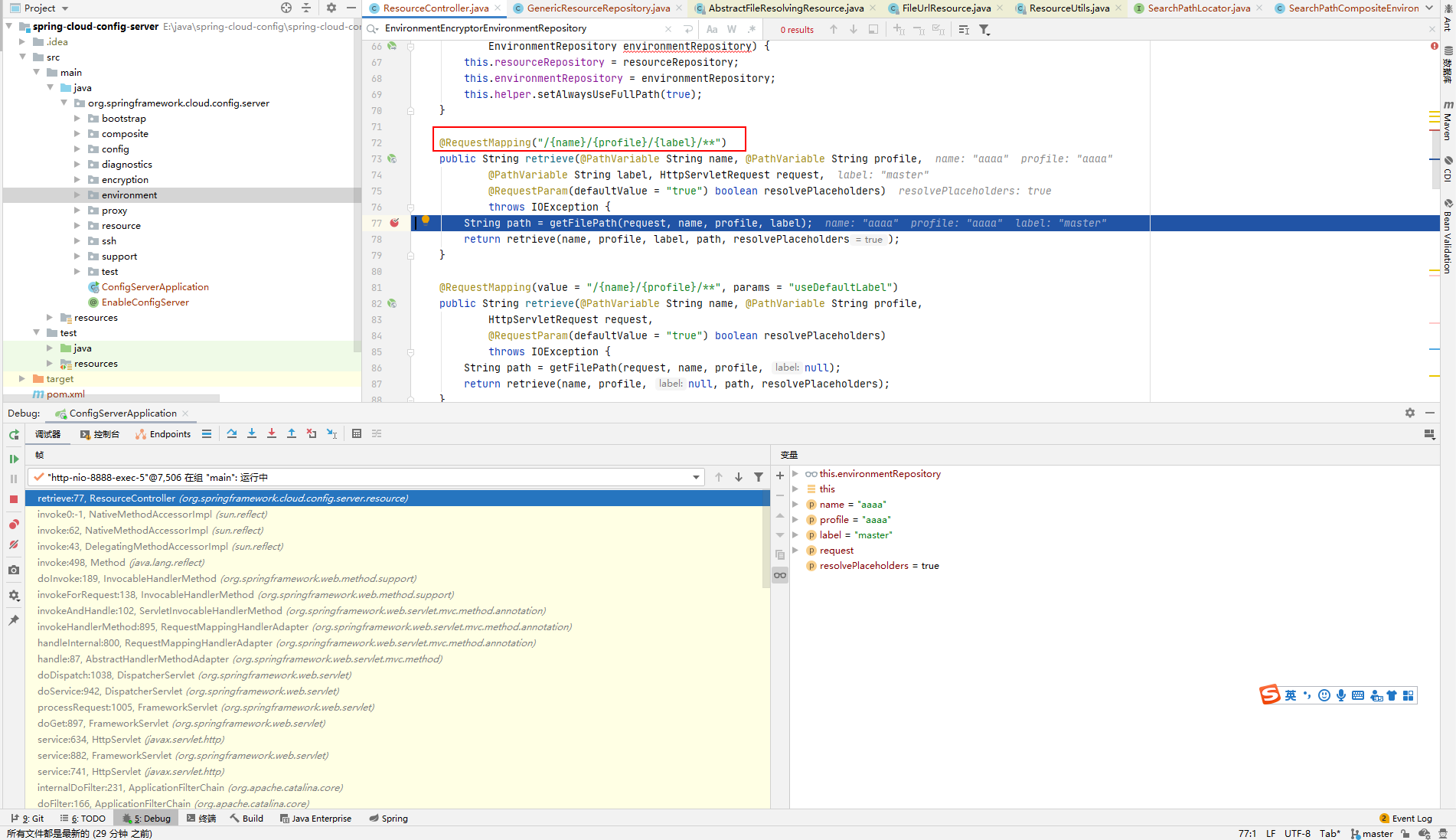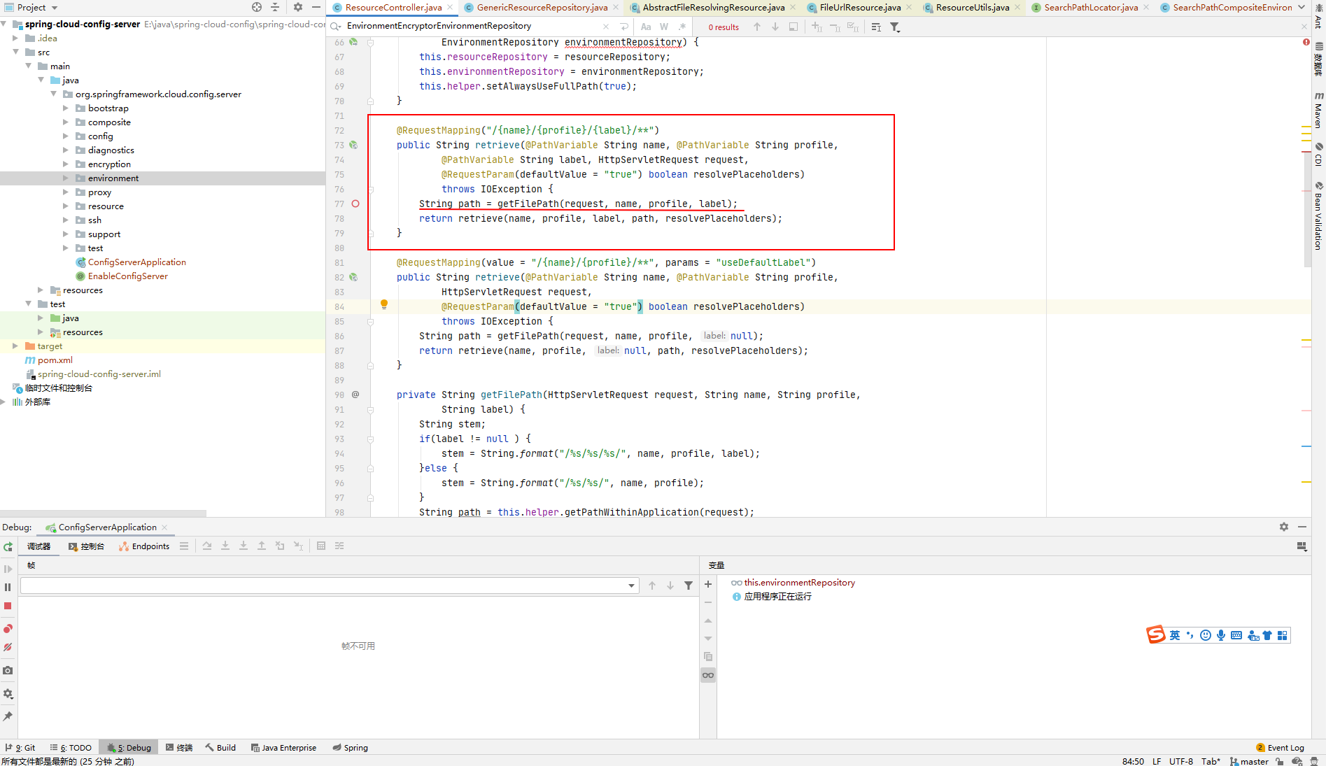 用 IDEA 打开 spring-cloud-config-server 的目录,spring-cloud-config 分为 server 端和 client 端,该漏洞是爆发在 server 端,所以打开的是 server 端的源码。断点在图中 ResourceController.java 的 77 行。
