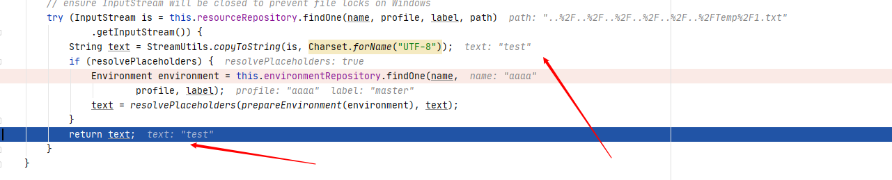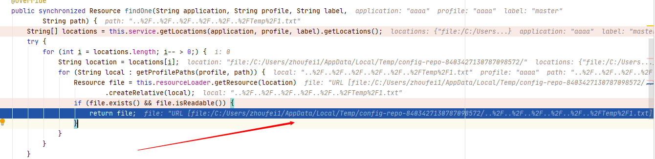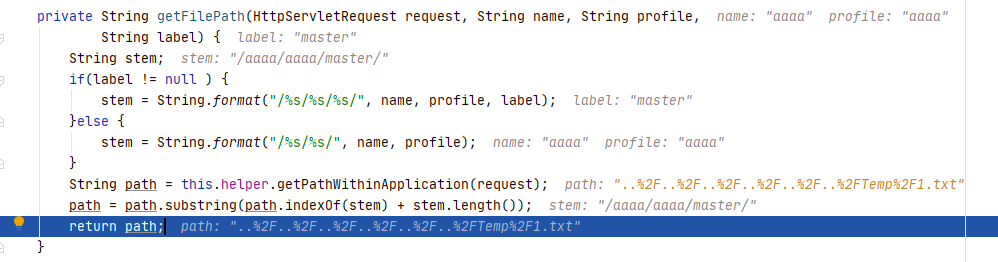 直接来到 return,可以看到 IDEA 帮我们把变量的数值都已经计算出来了。通过 return 的 path 可知,这个 getFilePath 是用来获得 POC 里 URI 路径里的最后一段内容..%252F..%252F..%252F..%252F..%252F..%252FTemp%252F1.txt