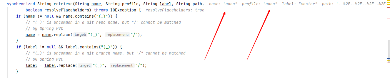根据源码可知,前两个 if 是用来替换目录中含有(_)为/的逻辑,一个替换 name 位置,一个替换 label 位置,直接来到 try 位置。看看 IDEA 告诉我们 name 和 label 具体对应的是什么。