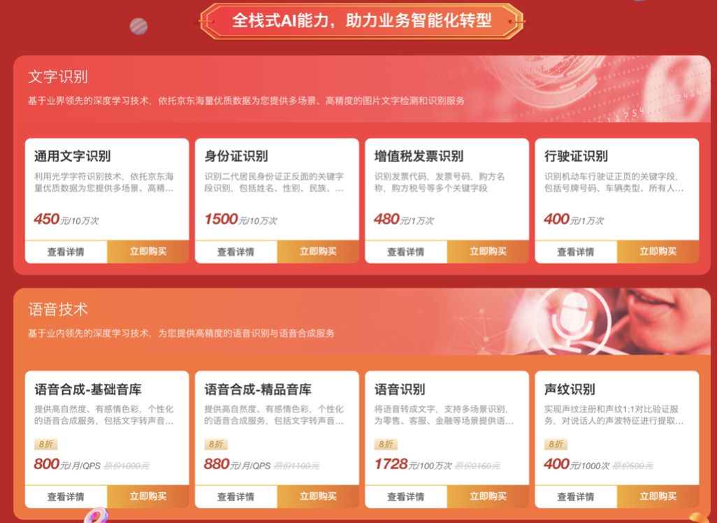 这一套人工智能技术,京东智联云已经通过NeuHub平台向京东品牌供应商和外部企业全部开放。在“京东智联云 618 大促”的AI 产品专场中,企业用户可以享受超级折扣和超值服务购买这些AI 产品。文字识别、语音技术、自然语言处理、人脸与人体识别、图像及视频理解、商品理解、内容审核等系列AI产品,统统限时8折优惠。