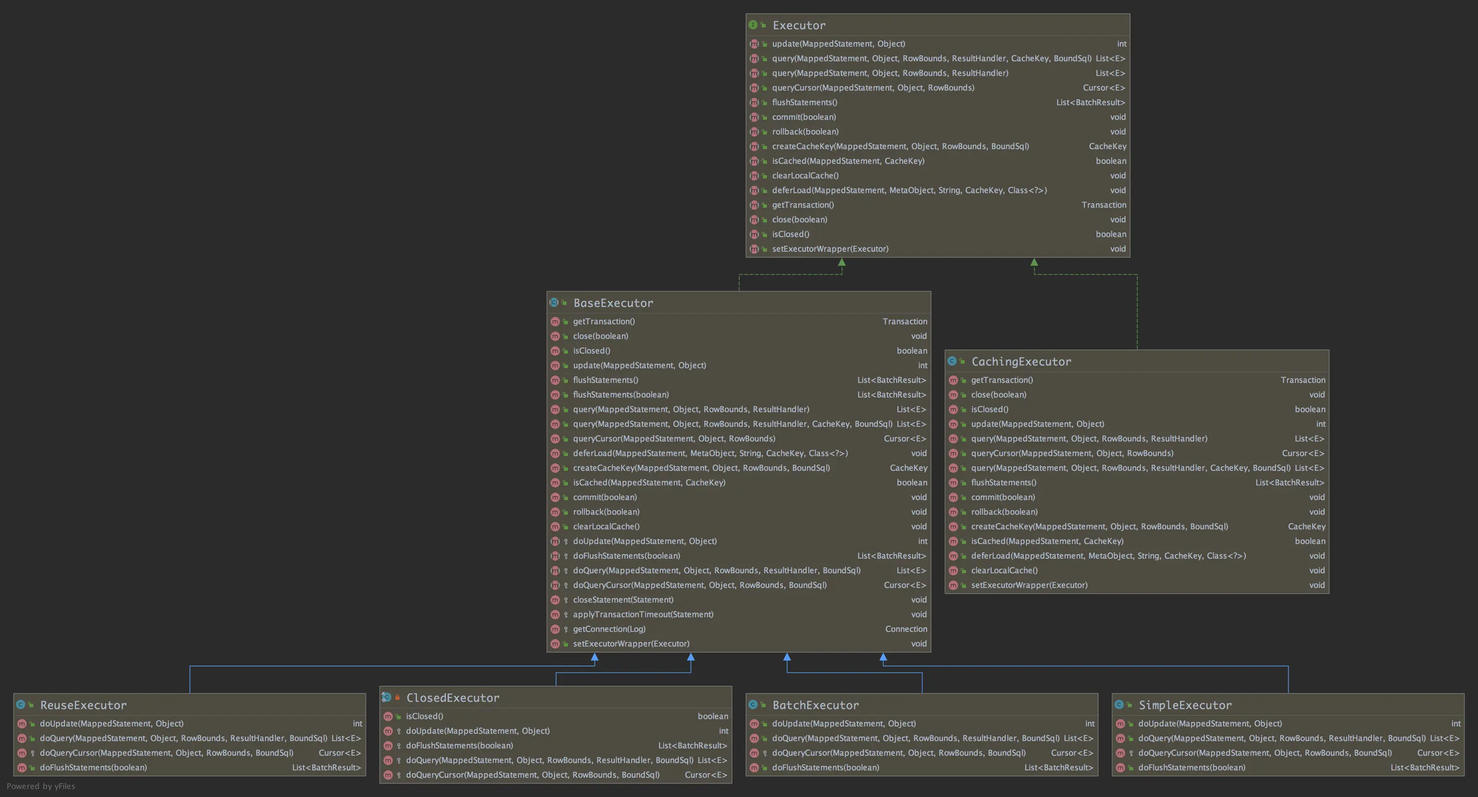 如上图所示,位于继承体系最顶层的是Executor执行器,它有两个实现类,分别是和BaseExecutor和CachingExecutor。