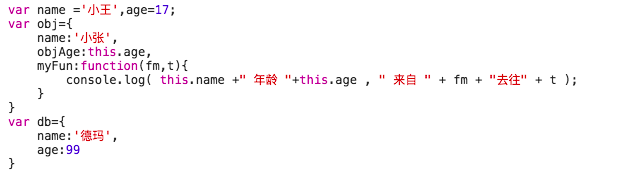 2. obj.myFun.apply(db,['成都','上海']); //德玛 年龄 99 来自 成都去往上海