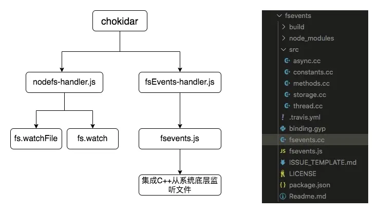 为了解决以上问题,chokidar将内部核心内容分为两块,分别是nodefs-handler.js和fsEvents-handler.js,macOS使用fsEvents-handler.js监听文件变化,其它系统用nodefs-handler.js,用户可以通过options.useFsEvents配置强制使用fsEvents-handler.js来监听文件变化。fsEvents-handler.js内部又依赖fsevents模块,fsevents集成了C++从系统底层来监听文件变化,一图胜千言