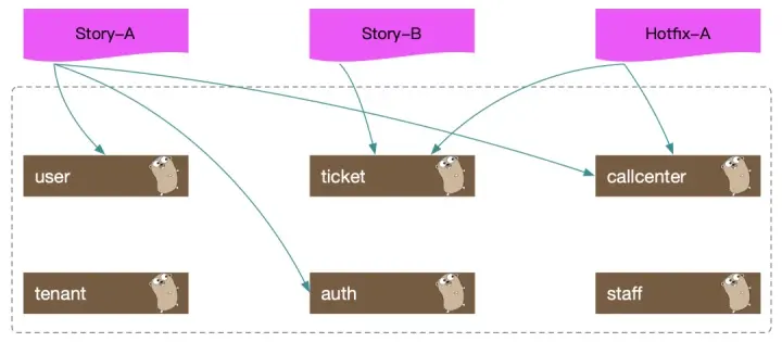 业务发展往往导致并行迭代的增多,而这些并行迭代难免会改动到相同的服务,尤其是一些核心基础服务。如下图,